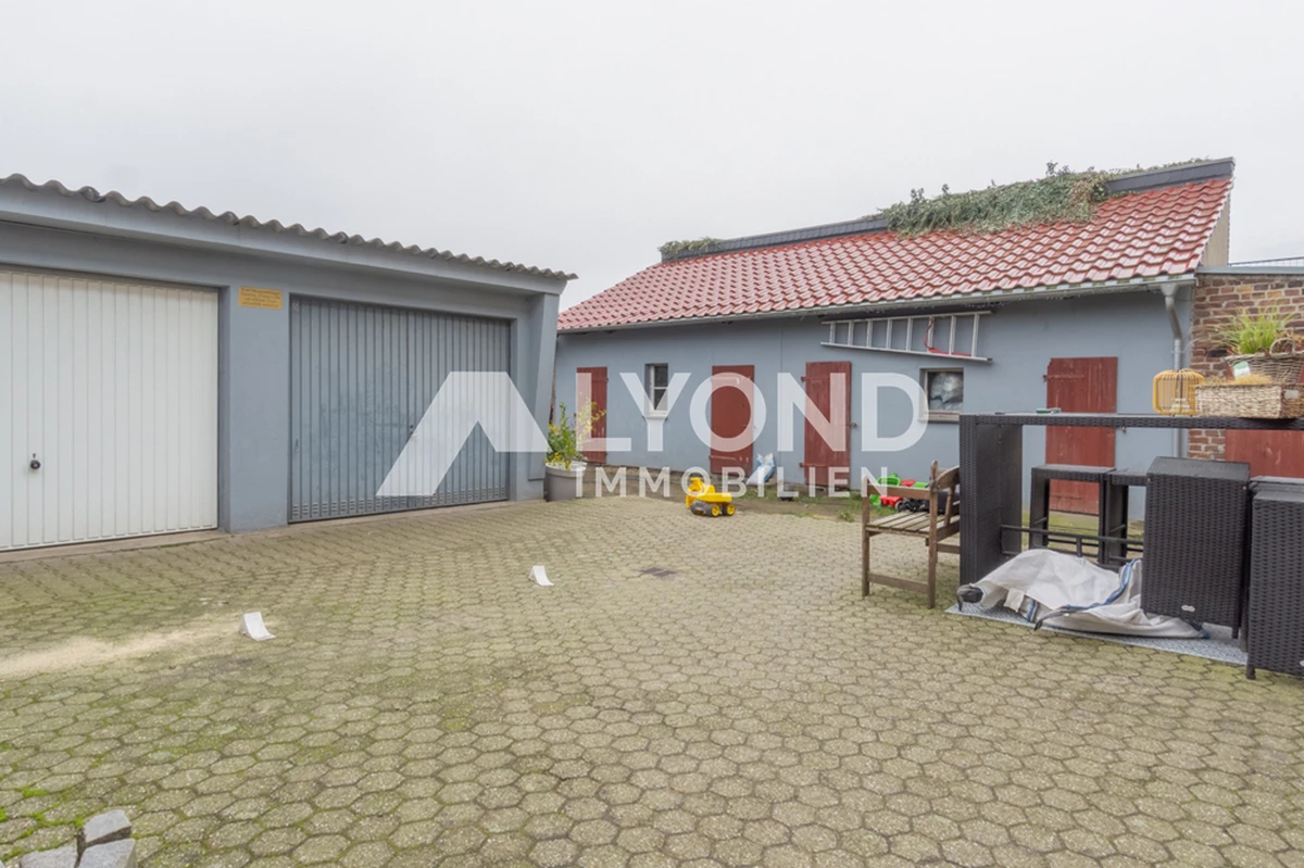 Das weitläufige Grundstück verfügt über einen Innenhof, fünf Schuppen, zwei Garagen, Stellplätze sowie einen gepflegten Garten mit Pavillon und Holzhütte, die übernommen werden können.