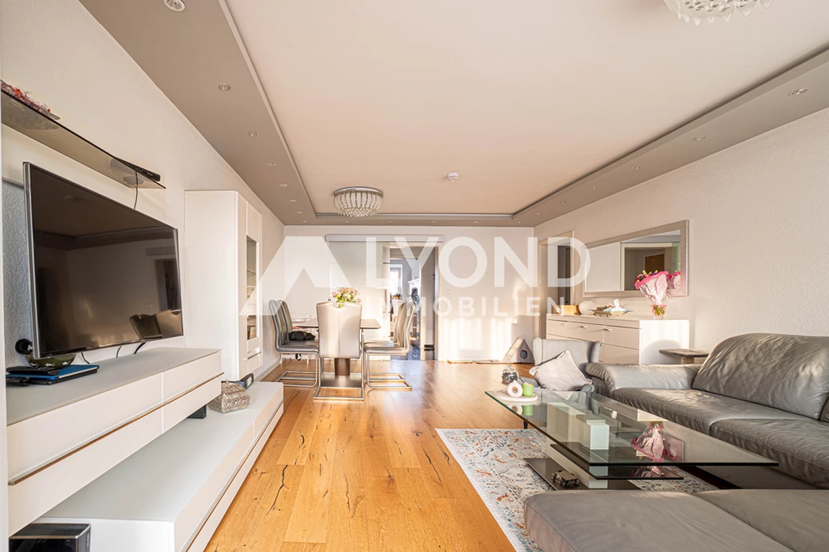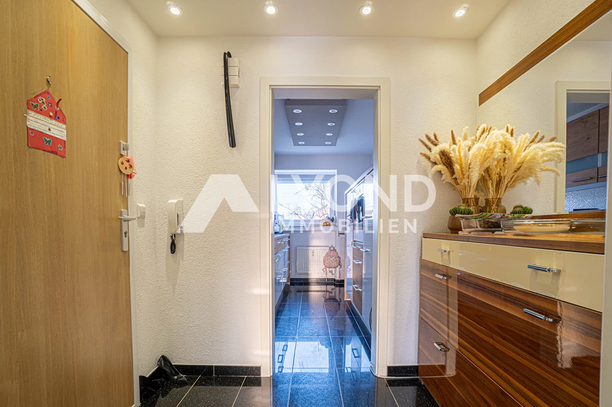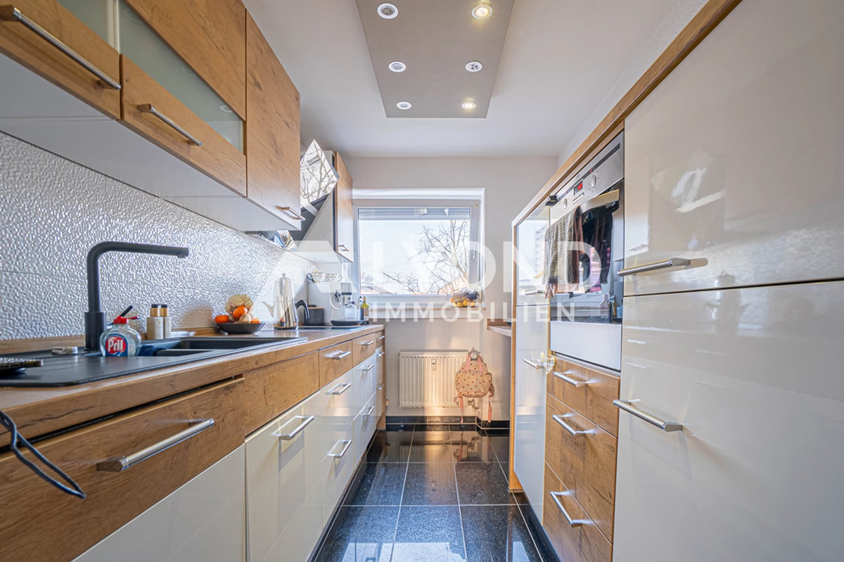 Der helle Wohn- und Essbereich bildet den Mittelpunkt der Wohnung und bietet direkten Zugang zum Balkon, der zu entspannten Stunden im Freien einlädt. Die vorhandene Einbauküche ist funktional ausgestattet und fügt sich harmonisch in das Gesamtbild ein.