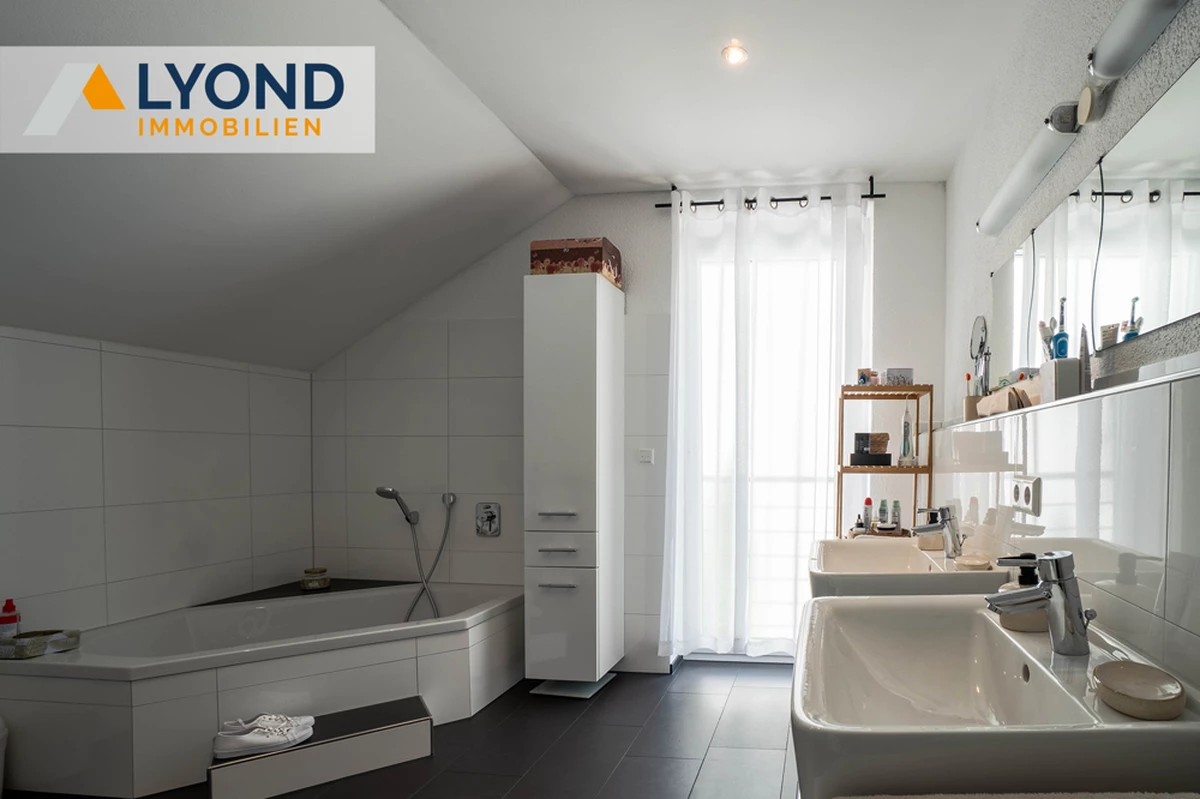 Das Badezimmer ist ein besonderes Highlight: Eine elegante Eckbadewanne, eine großzügige Dusche und ein WC sorgen für maximalen Komfort. Zusätzlich gibt es ein Gäste-WC, das für Besuchende praktisch ist. Eine Abstellkammer bietet zusätzlichen Stauraum und trägt zur Ordnung im Haus bei.