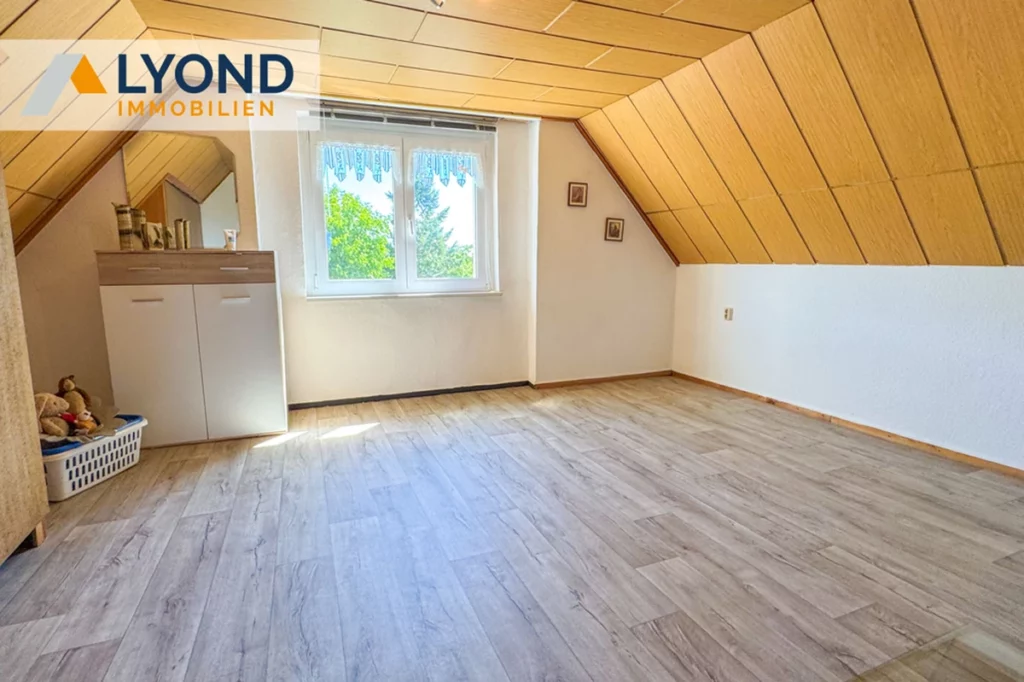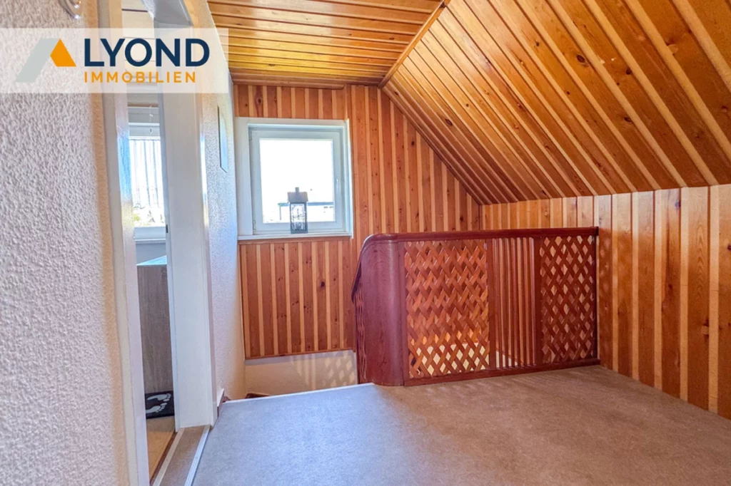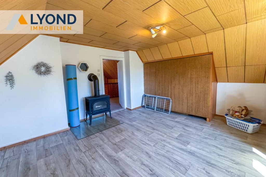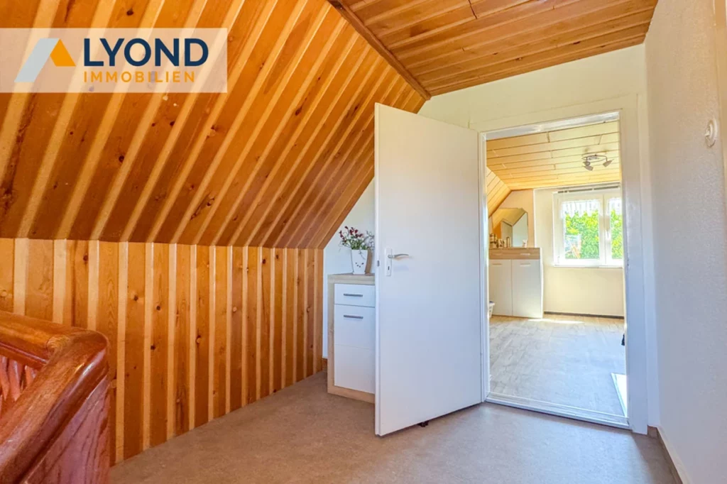Im Inneren überzeugt das Haus durch eine klare und funktionale Aufteilung. Das Erdgeschoss beherbergt die Küche mit Zugang zur überdachten Holzterrasse, einen offenen Wohn- und Essbereich sowie ein Badezimmer mit ebenerdiger Dusche. Im Obergeschoss mit seinen gemütlichen Dachschrägen befinden sich ein Schlafzimmer und ein Kinderzimmer. Der Spitzboden dient als zusätzlicher Stauraum, während der voll unterkellerte Bereich mit Vorratsraum und Lagermöglichkeiten für Holz oder Kohle die Nutzfläche perfekt ergänzt.