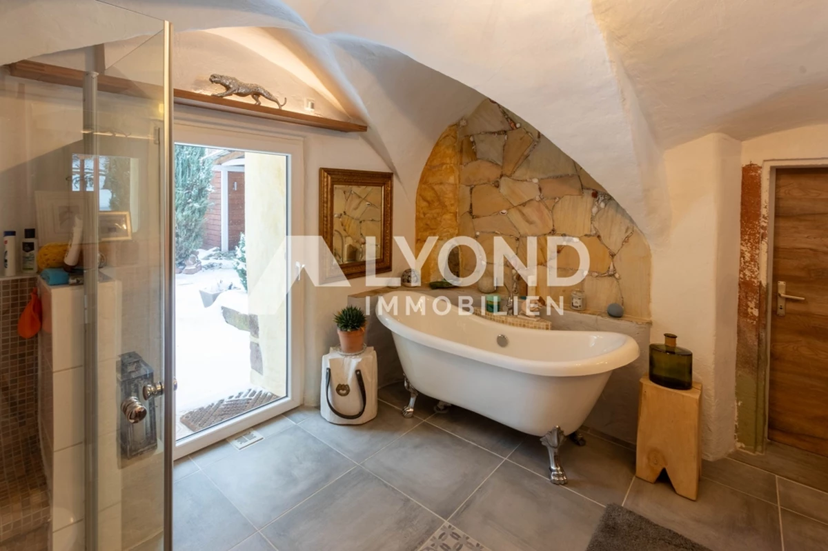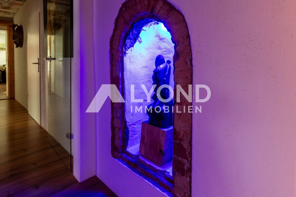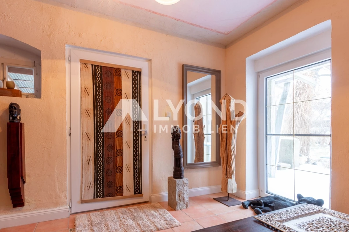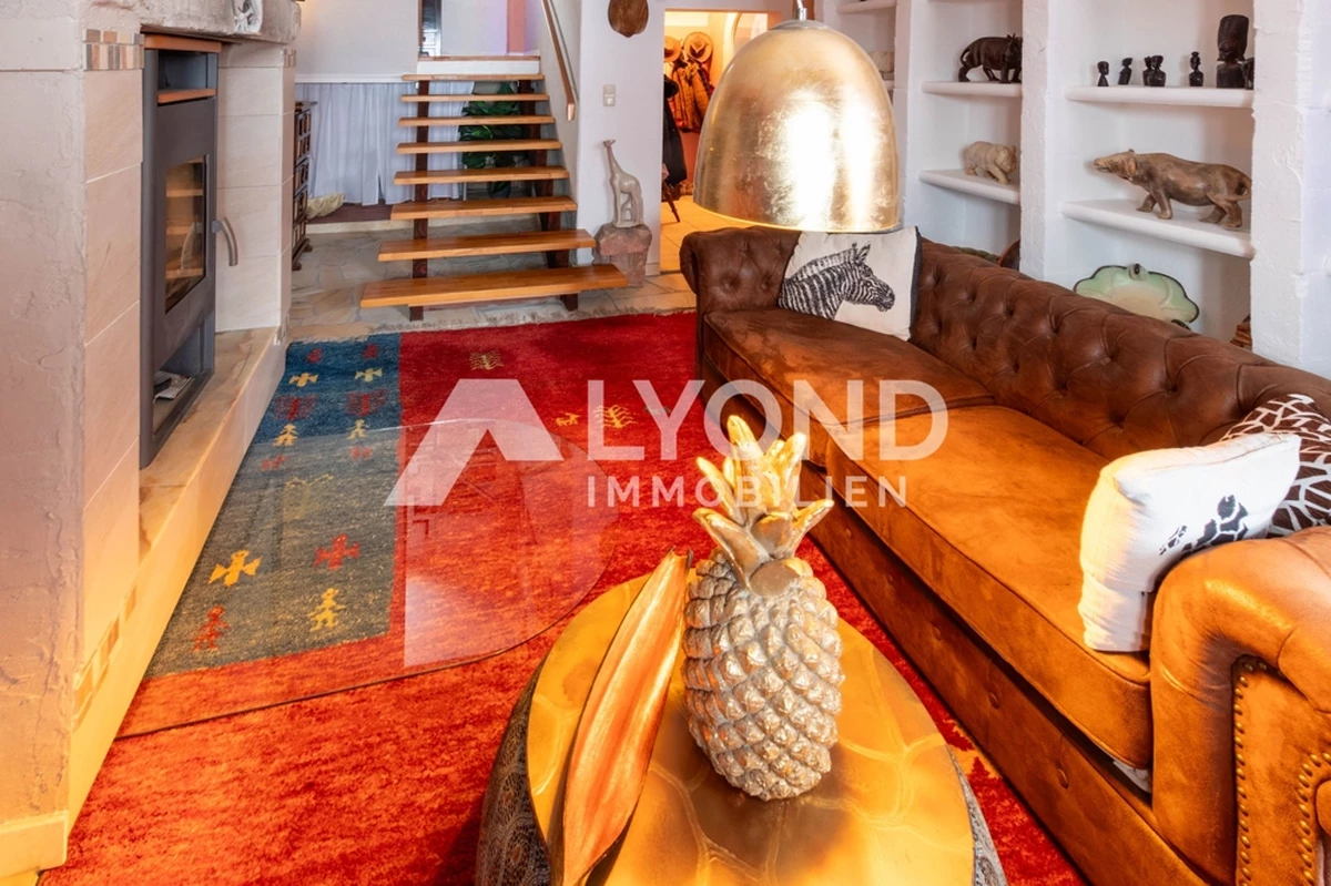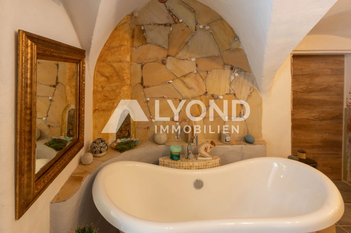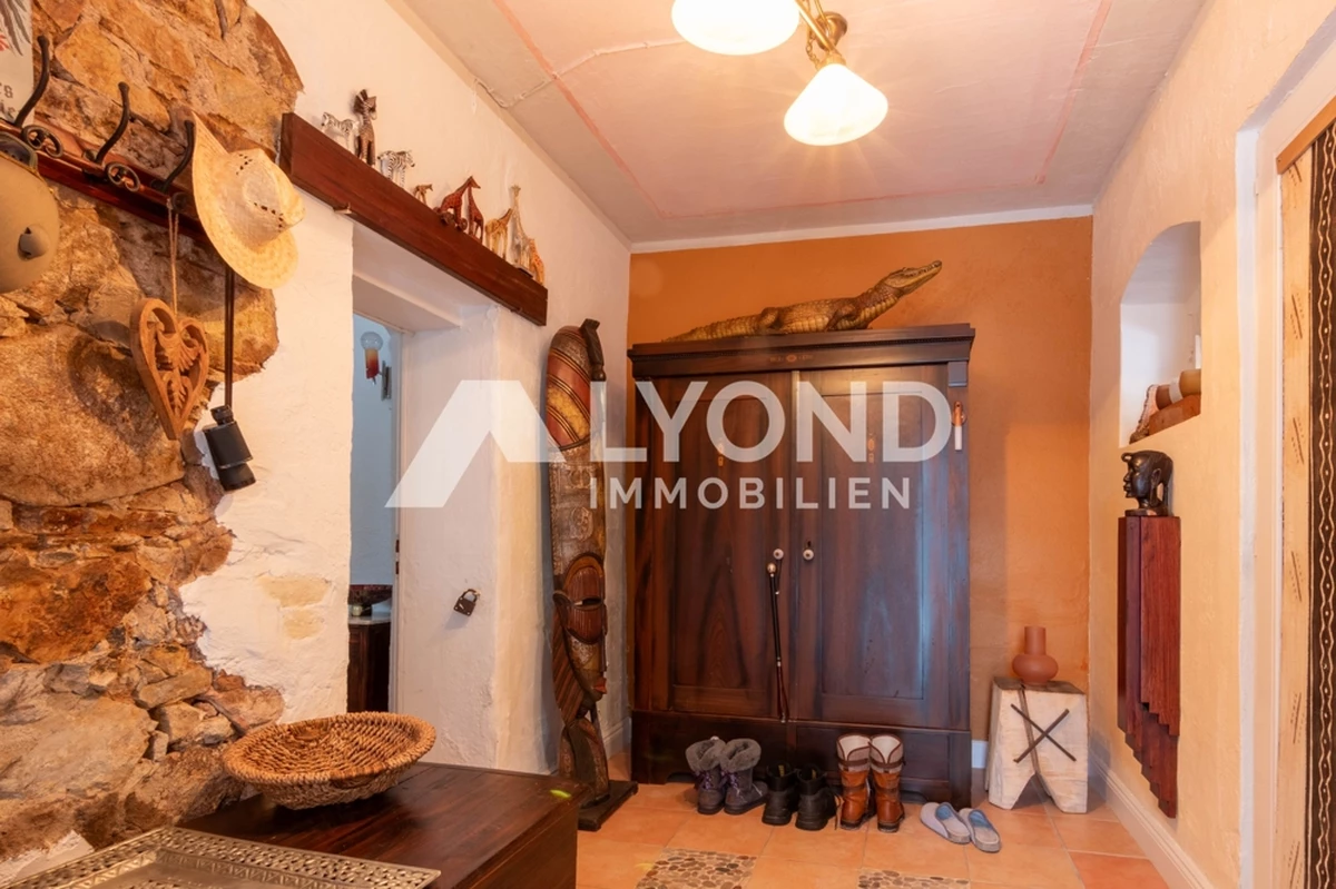 Im Inneren eröffnet sich ein außergewöhnliches Wohnkonzept, das sich bewusst von klassischen Gestaltungsmustern abhebt. Die Räume sind mit großer Liebe zur afrikanischen Architektur, Farbwelt und Materialität gestaltet. Warme Natur- und Erdtöne, strukturierte Wandoberflächen, Naturstein- und Holzelemente sowie historische Balken schaffen eine besondere Wohnatmosphäre mit Tiefe und Authentizität. Gewölbebereiche, bewusst unregelmäßige Wandführungen und sichtbare Originalmaterialien unterstreichen den individuellen Charakter des Hauses.