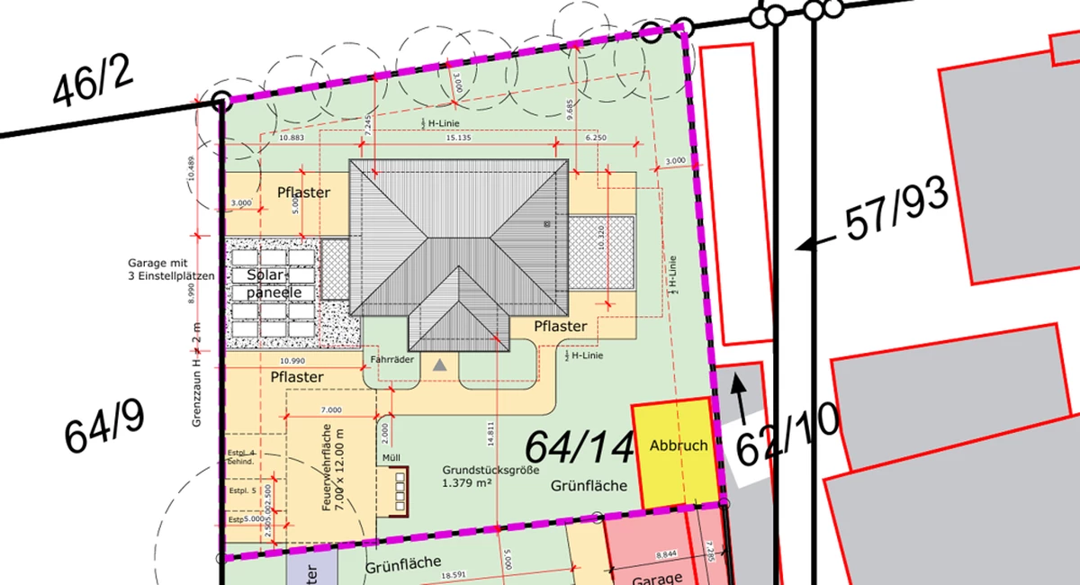 Für das Grundstück liegt bereits eine vollständig ausgearbeitete und genehmigte Planung für eine exklusive Stadtvilla mit integriertem Office und Garagen vor. Diese ermöglicht einen sofortigen Baustart ohne zeitintensive Genehmigungsphase und stellt eine attraktive Grundlage für ein modernes Wohn- und Arbeitskonzept dar.