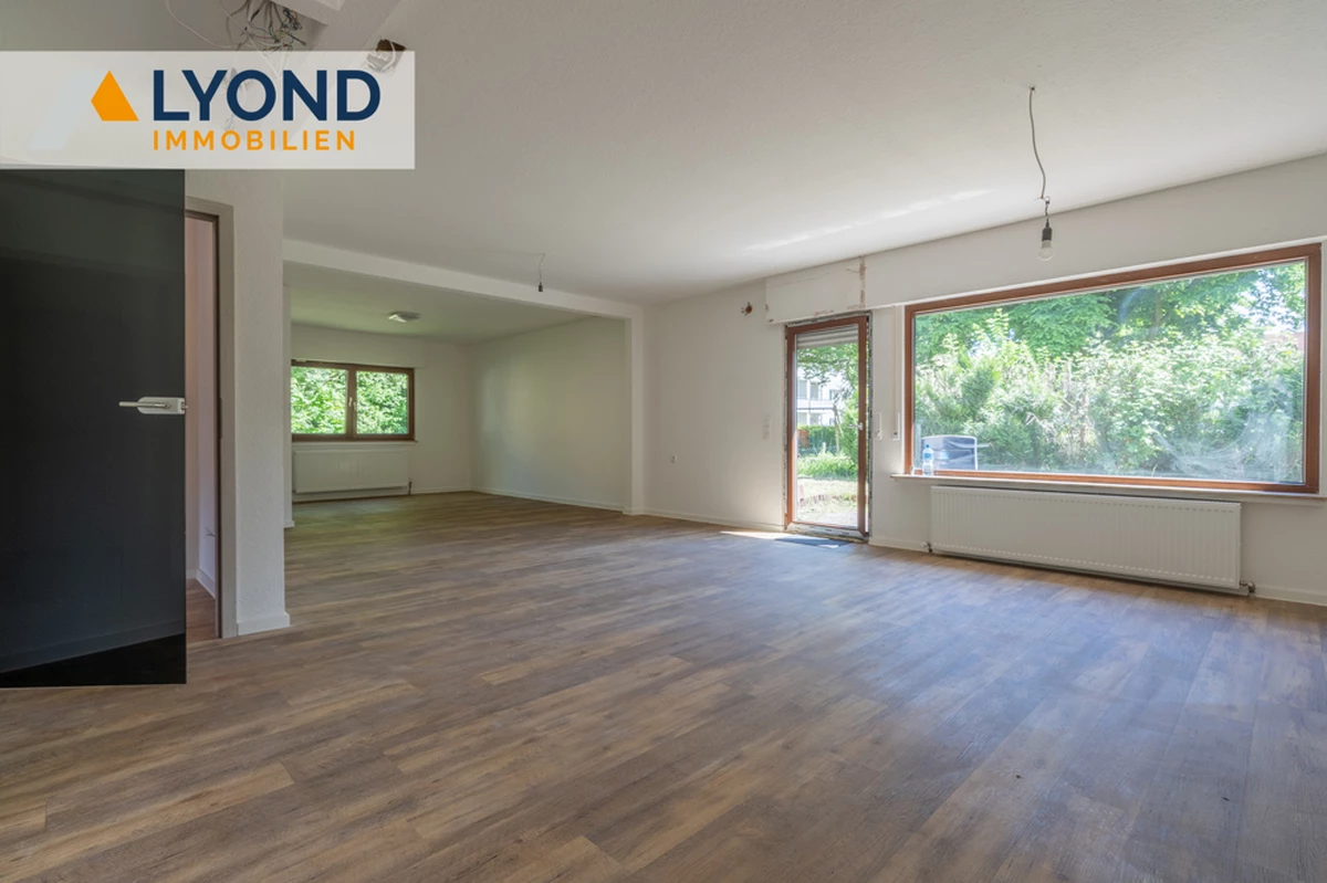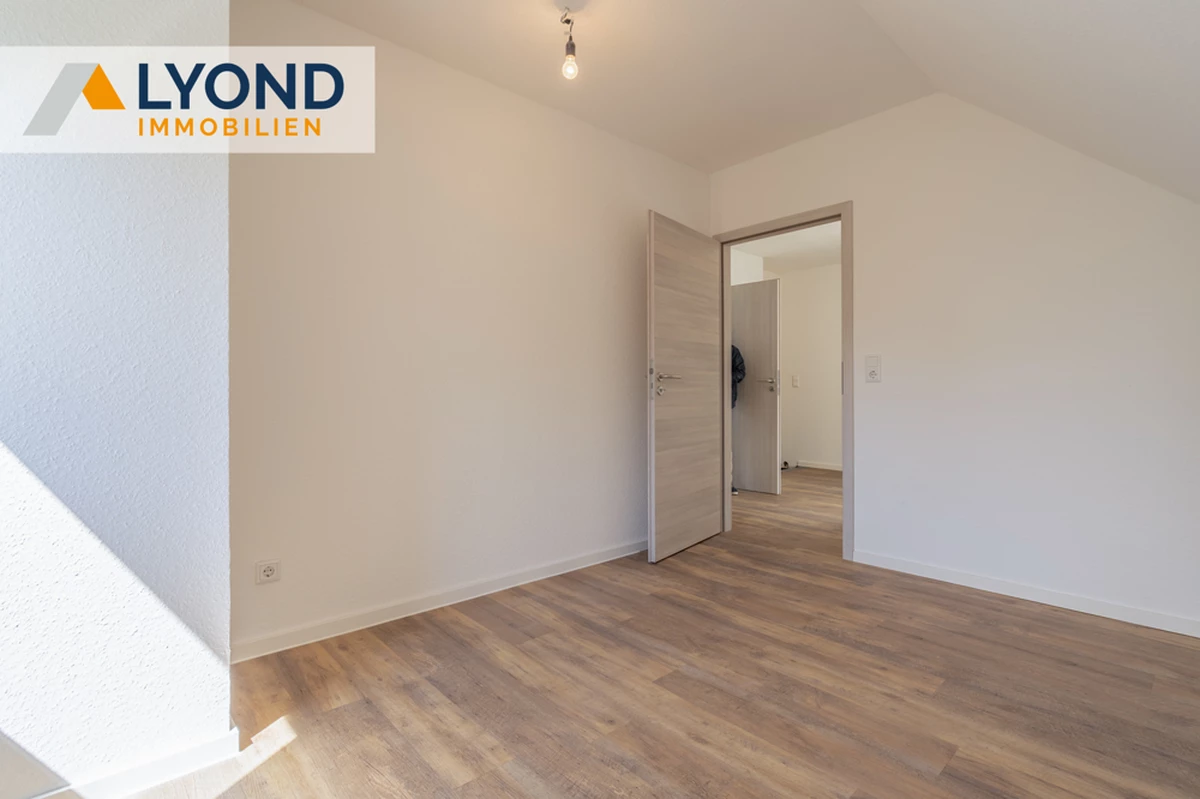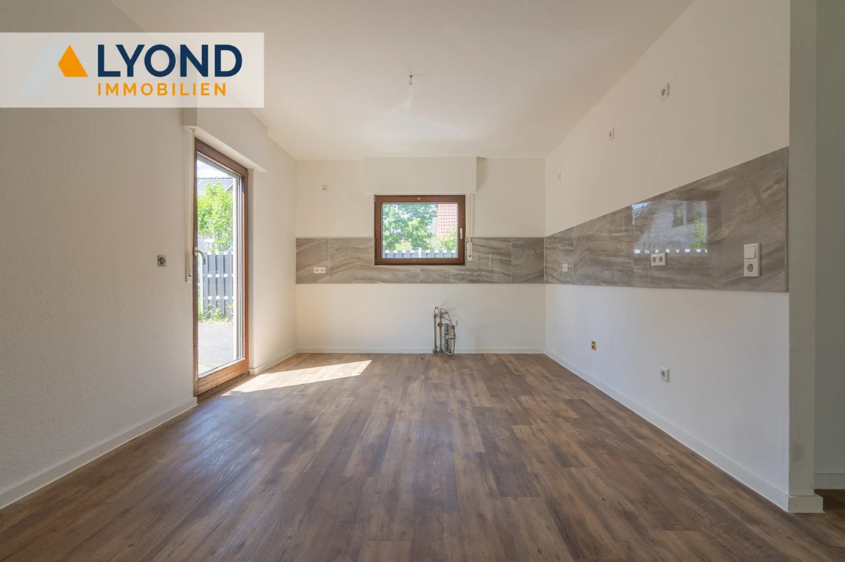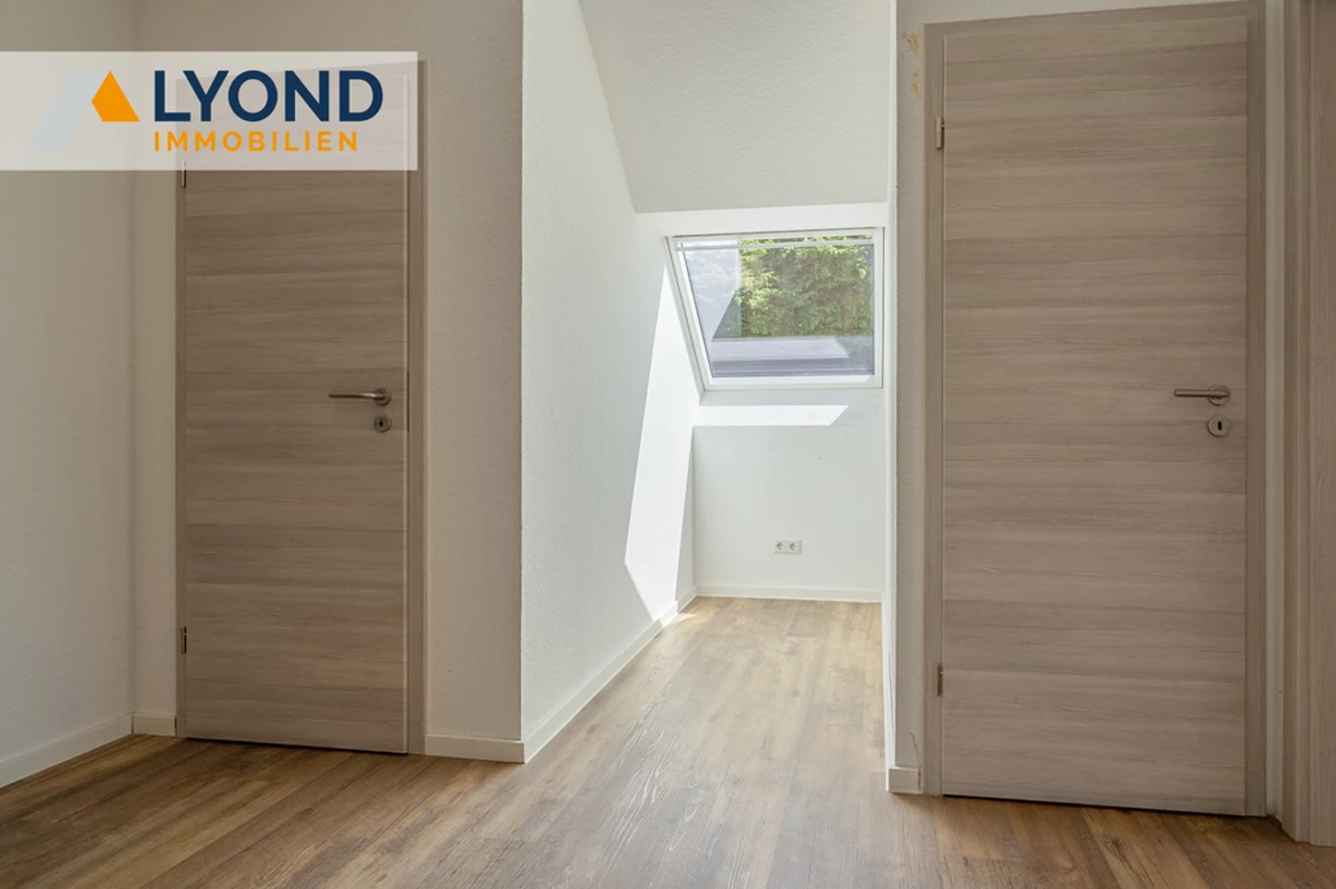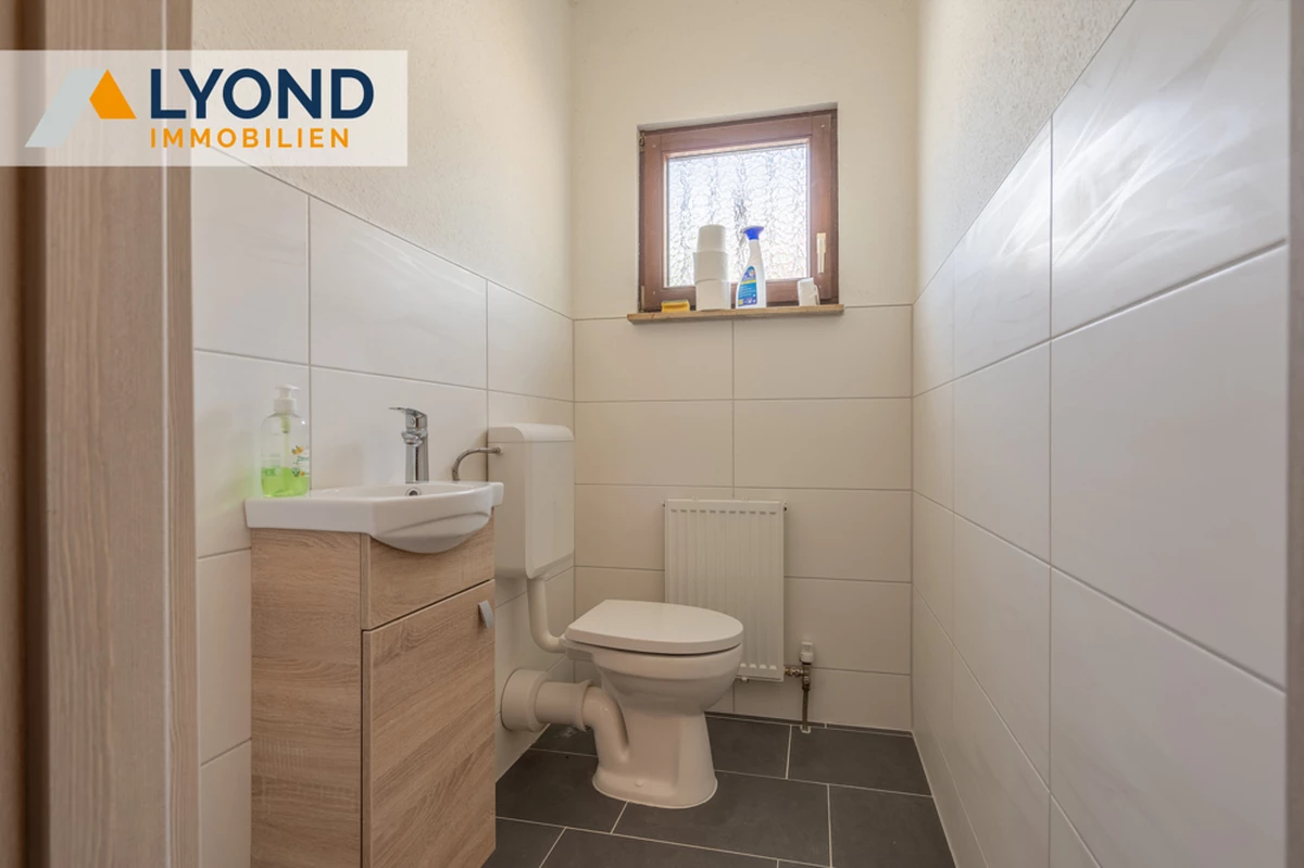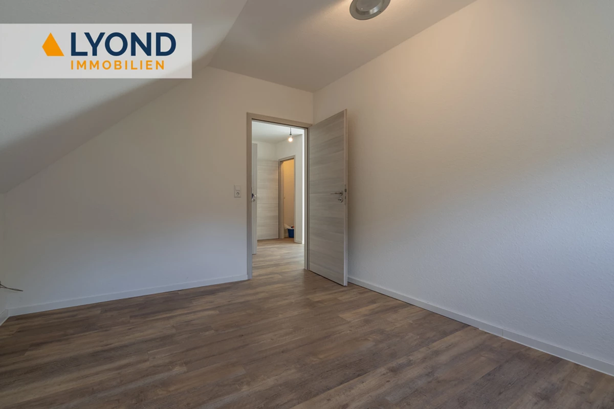 Die Hauptwohnung verteilt sich auf ca. 151 m² im Erd- und Obergeschoss. Im Erdgeschoss erwarten Sie ein großzügiger und lichtdurchfluteter Wohn- und Essbereich mit offener Küche, eine praktische Büroecke, direkter Zugang zur Terrasse, ein modernes Tageslichtbad mit bodengleicher Dusche sowie ein separates Schlafzimmer und ein Gäste-WC im Eingangsbereich. Das gesamte Erdgeschoss wurde kernsaniert und mit hochwertigem Vinylboden ausgestattet.