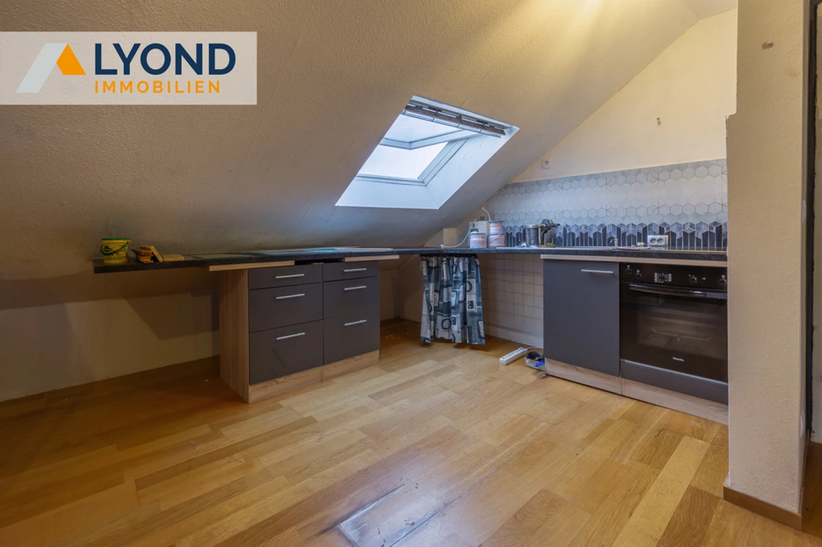 Beim Betreten der Wohnung fällt sofort die gute Raumaufteilung auf. Der Wohnbereich ist einladend und bietet Platz für eine gemütliche Sitzecke sowie einen kleinen Essbereich. Die Dachschrägen verleihen dem Raum eine besondere Atmosphäre. Direkt angrenzend befindet sich die kompakte, über Eck gestaltete Küche, die ausreichend Platz zum Kochen bietet.