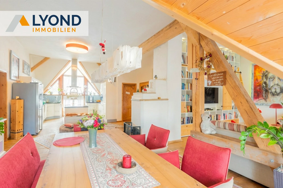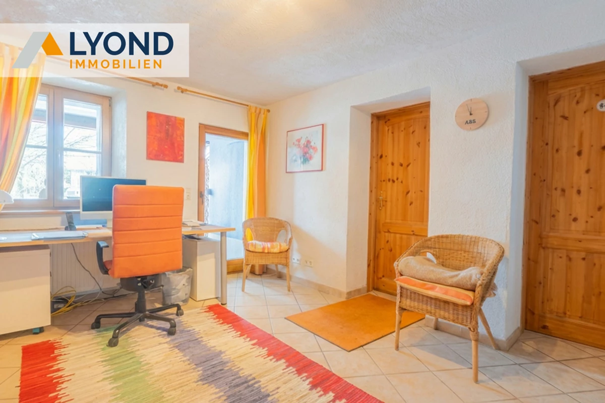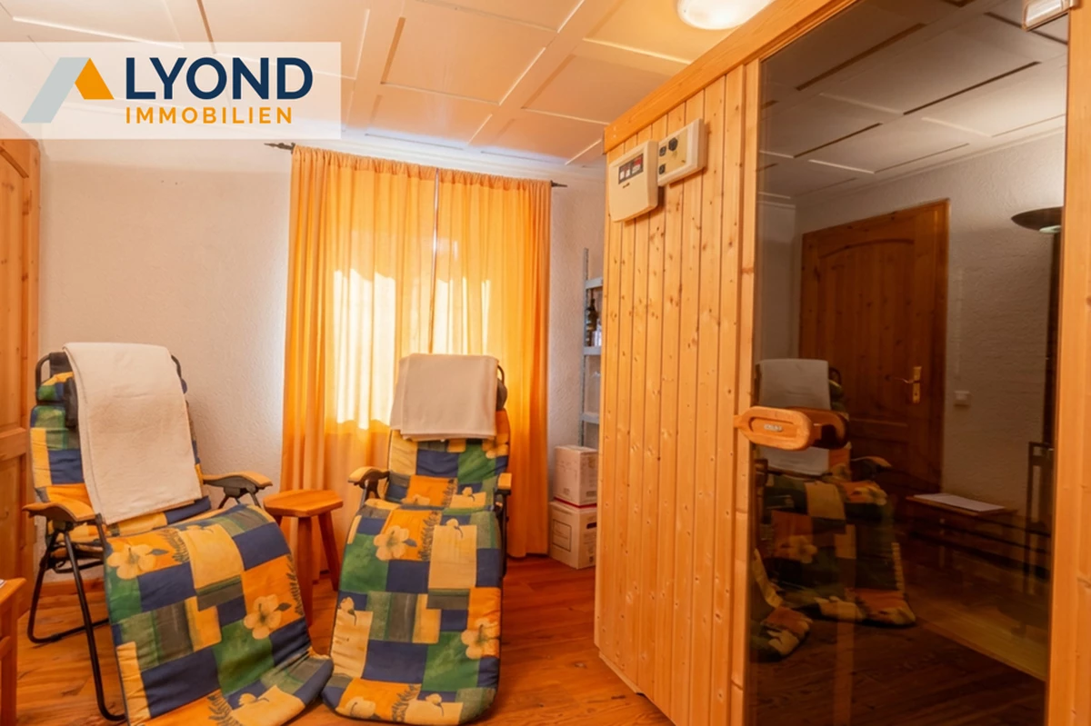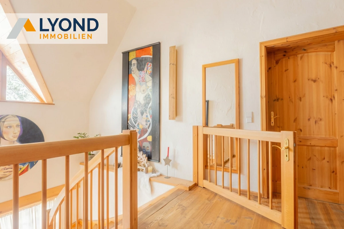 Naturmaterialien und die Helligkeit entsteht. Im Erdgeschoss empfängt Sie ein weitläufiger und repräsentativer Eingangsbereich. Es folgen zwei helle Büroräume für konzentriertes und ruhiges Arbeiten. Diese können auch durch einen separaten Eingang (z.B. für Kunden und Klienten) erreicht werden, oder als weiteren Wohnraum genutzt werden. Zusätzlich befindet sich im EG auch eine Sauna, ein Duschbad, der Heiz- und Waschraum, mit Zugang zu Garten und Terrasse. Die Räume imErdgeschoß (außer der Diele) können durch eine Kaminofen angenehm beheizt werden. Von der Terrasse blicken Sie in den Garten mit Blumenbeeten, Obstbäumen, Hochbeeten und einem Gewächshaus. Ideal für Hobbygärtner und Selbstversorger.Eine großzügige Garage, sowie zusätzliche Stellplätze erweitern die Möglichkeiten. Durch die breite Treppe in der Diele gelangen Sie in den großzügigen und gemütlichen Wohnbereich, der durch seine Spitzgaupen und den 2 Zugängen zum Balkon besticht.