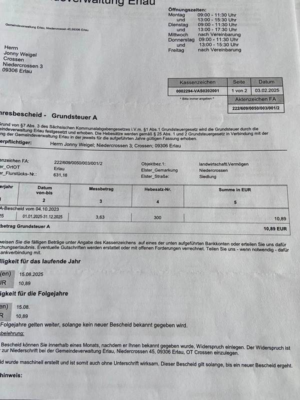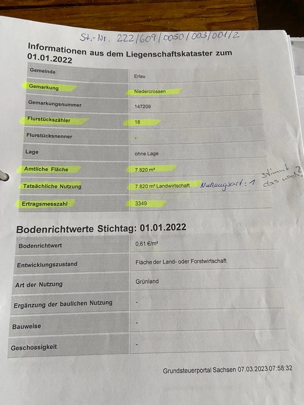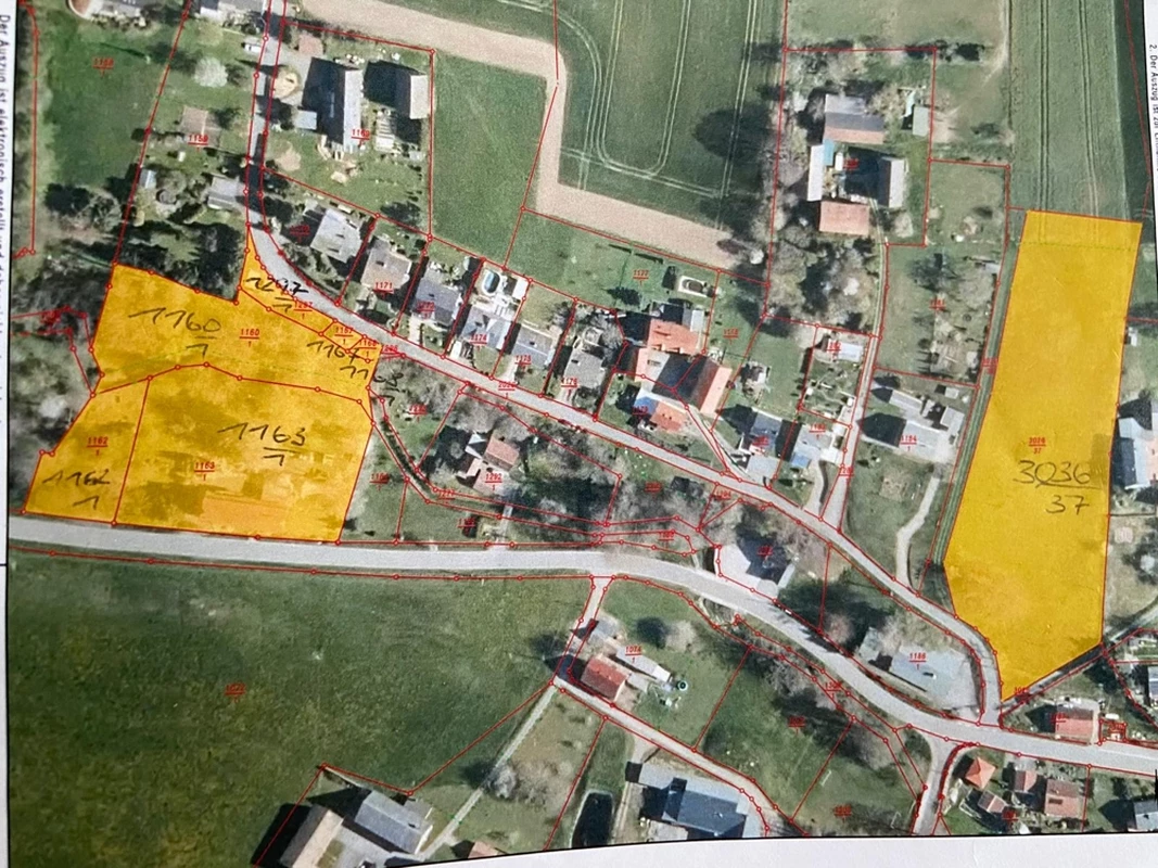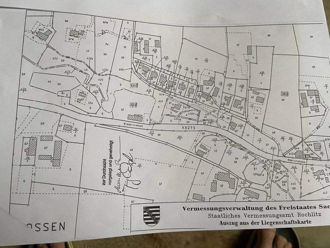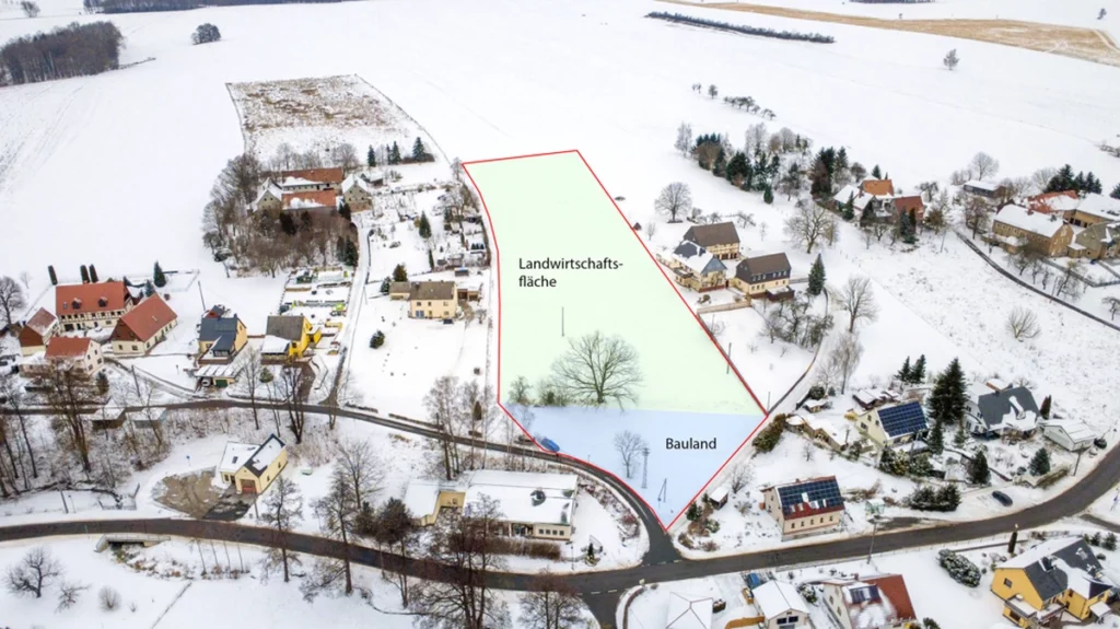 Das angebotene Grundstück in Niedercrossen (Ortsteil von Crossen, Gemeinde Erlau) umfasst insgesamt ca. 7.820 m², davon ca. 1.000 m² als ausgewiesenes Bauland, der restliche Bereich derzeit landwirtschaftliche Fläche. Durch eine frühere Flurstücksneuordnung entstand dieses zusammenhängende Grundstück, das sich entlang einer kurzen, befestigten Nebenstraße hinter einer gabelnden Zufahrt zur Hauptstraße befindet.