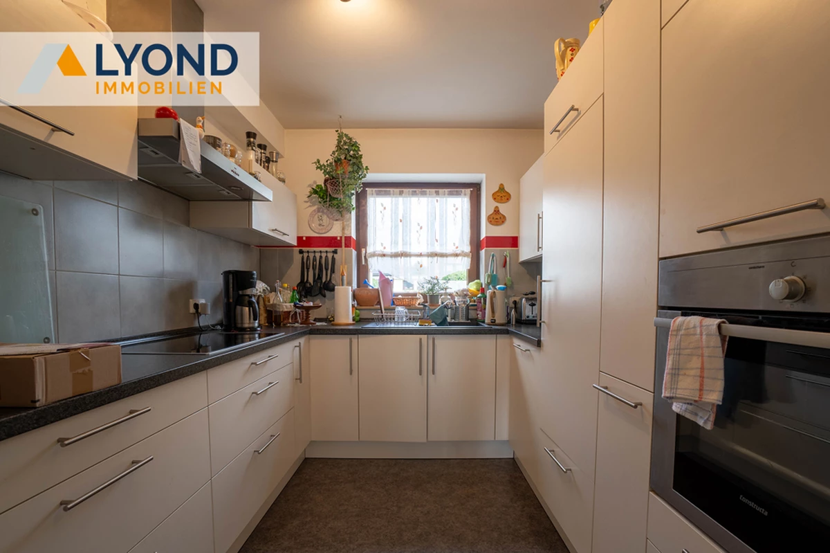 Die gut geschnittene Küche bietet ausreichend Platz zum Kochen und schließt direkt an den großzügigen Wohnbereich an, der viel Tageslicht erhält und Zugang zur sonnigen Terrasse hat. Diese lädt zu gemütlichen Stunden im Freien ein.