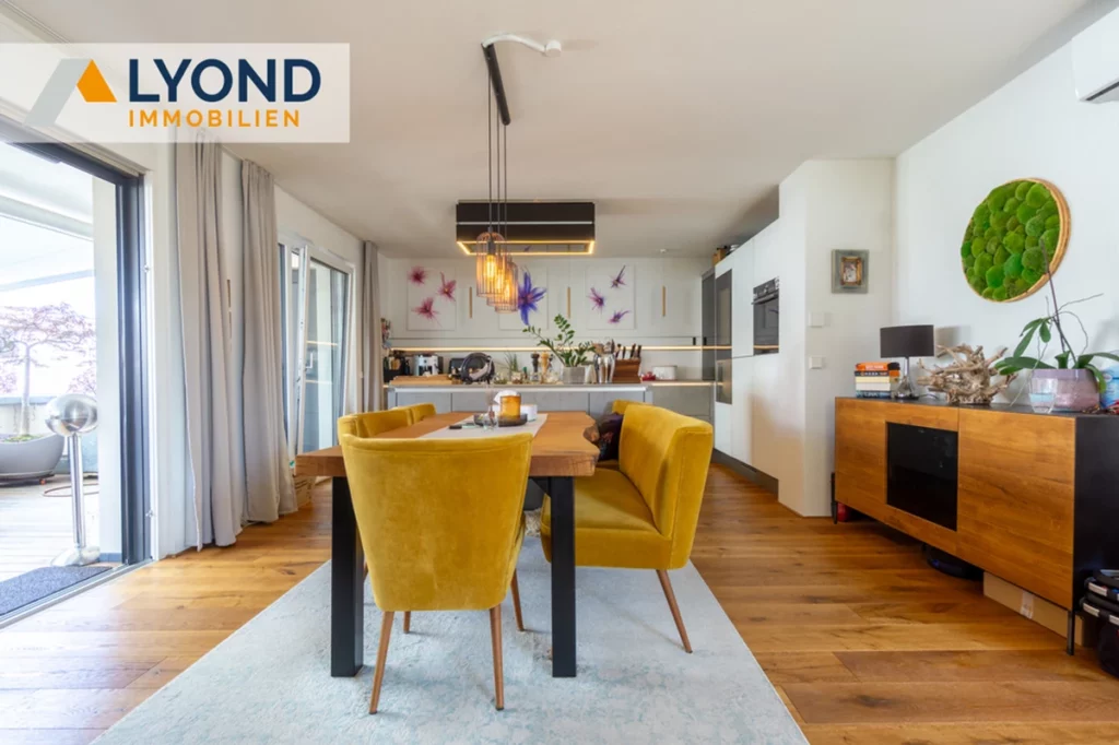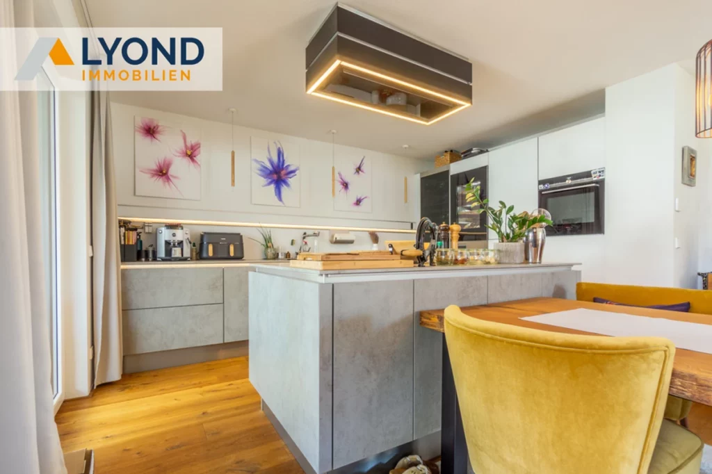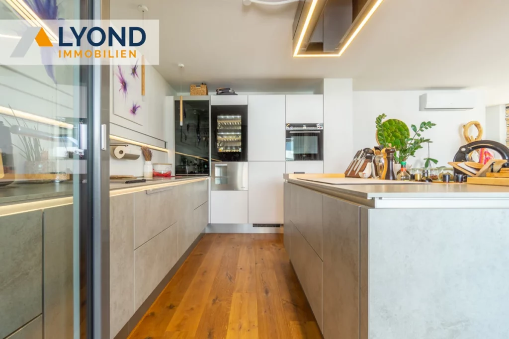 Auf rund 100 m² Wohnfläche erwartet Sie ein offener Grundriss, der Licht, Raum und Luxus miteinander verbindet. Edles Eichenparkett und hochwertige Fliesen schaffen eine warme, einladende Atmosphäre. Die exklusive Designerküche – ausgestattet mit hochwertigen Geräten, Gefrierschrank, Weinkühler und einer Gastronomie-Eiswürfelmaschine – ist ein Paradies für Genießer. Ein maßangefertigter Kleiderschrank vereint Stil und Funktionalität.