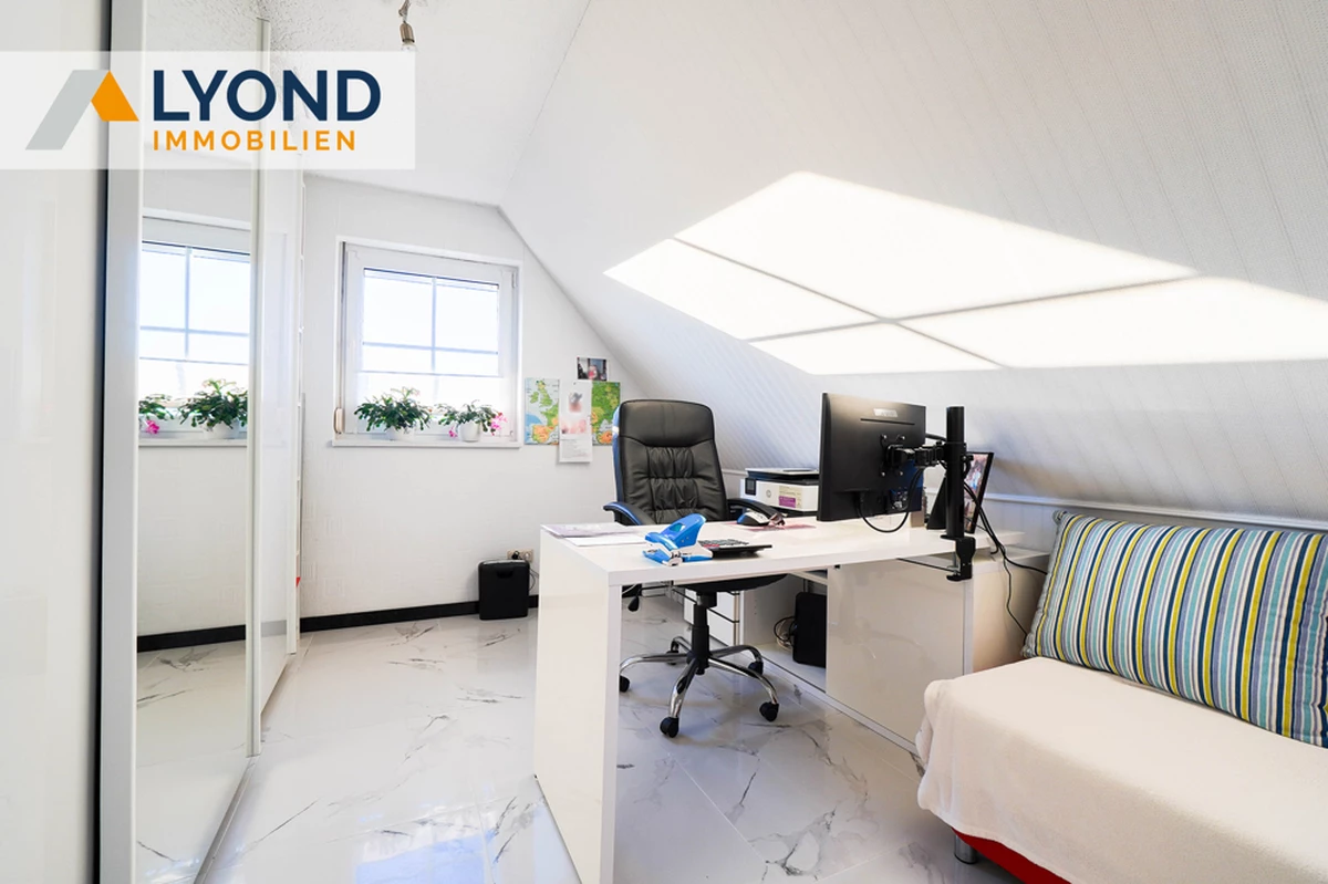 Flur, Badezimmer mit Wanne, Büro, Kinderzimmer, Schlafzimmer mit Klimaanlage, Terrasse ca. 28 m², Zugang über Schlafzimmer