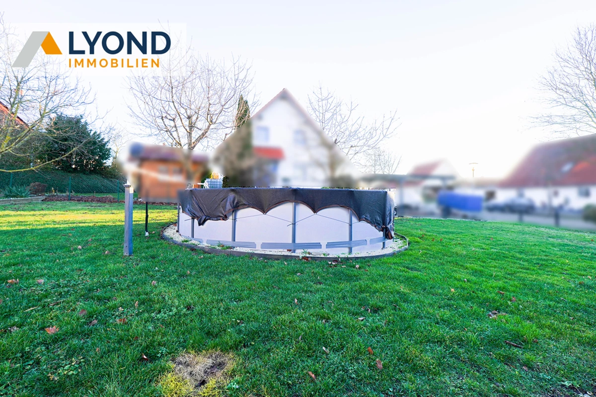 Großzügiger Garten mit Pool (1,20 m tief, 4,88 m im Durchmesser), Außenterrasse mit elektrischer Markise, Geräteschuppen, Garage mit Wartungsgrube und elektrischem Sektionaltor, gepflasterte Hofeinfahrt mit Stellplatz neben dem Haus
