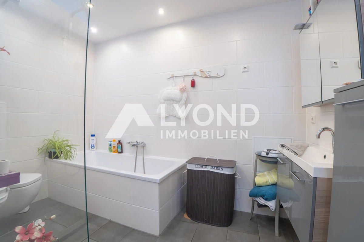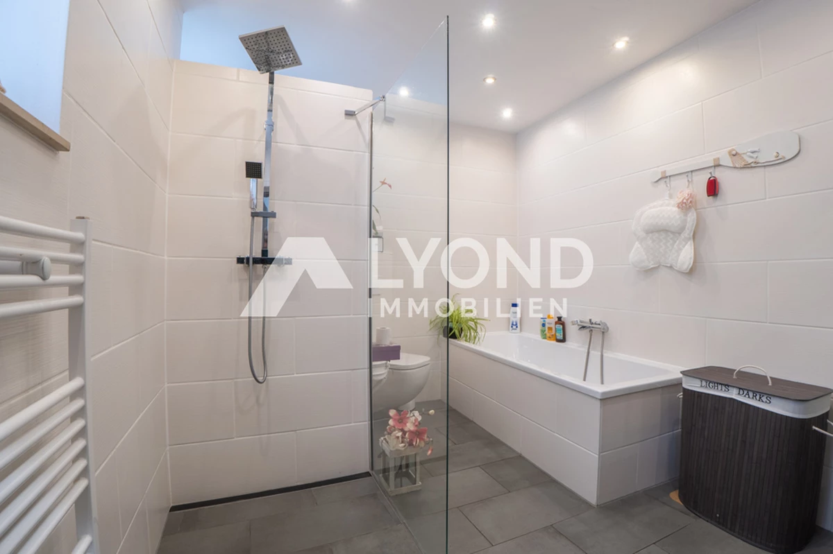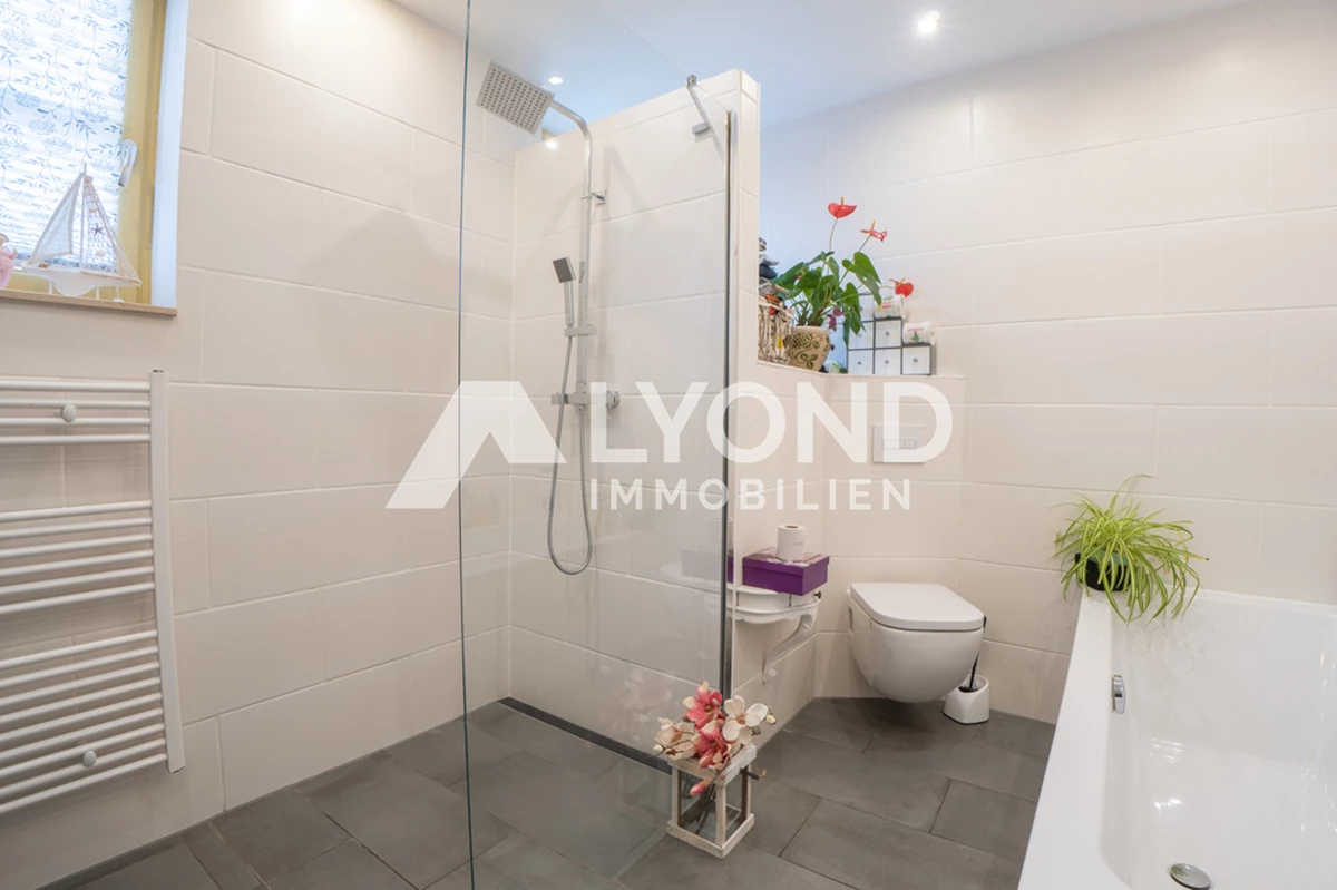 Im Erdgeschoss befinden sich der Eingangsflur, die Küche sowie ein großzügiges Badezimmer mit bodengleicher Dusche und Badewanne. Von dieser Ebene aus gelangen Sie direkt in den Innenhof. Die Küche ist mit einer Fußbodenheizung ausgestattet.