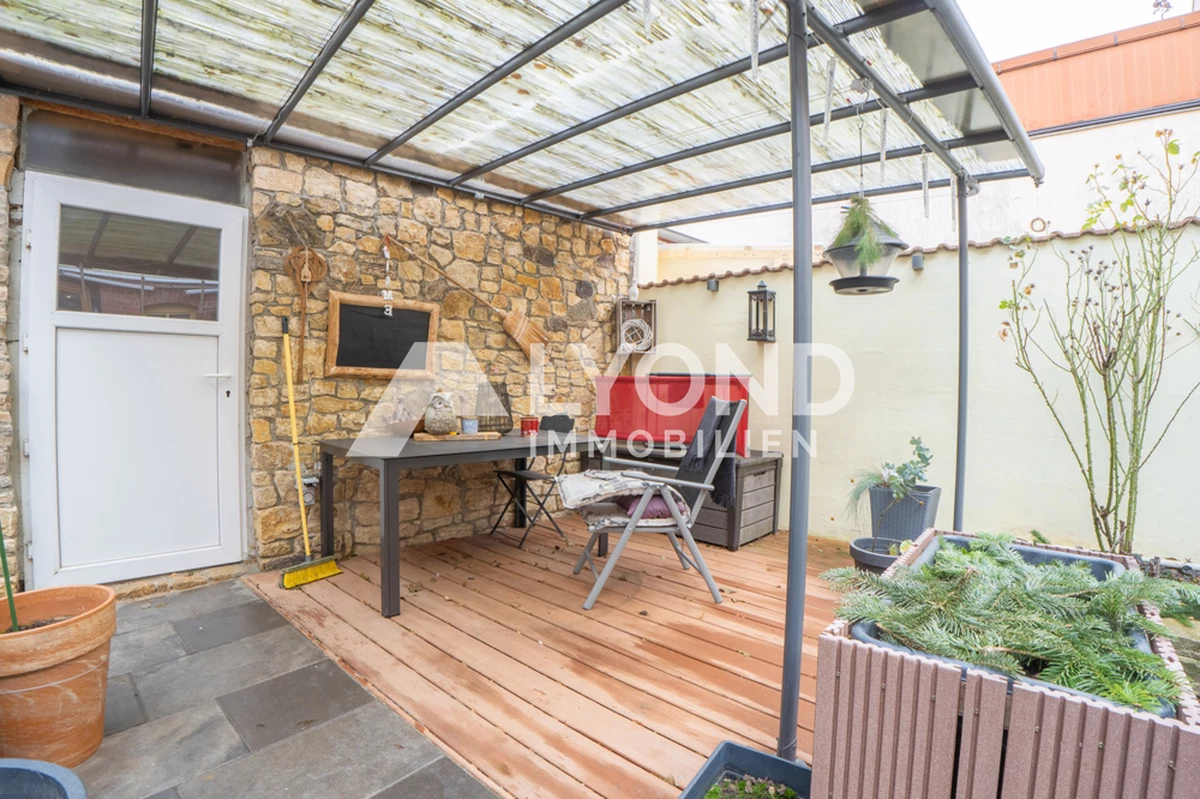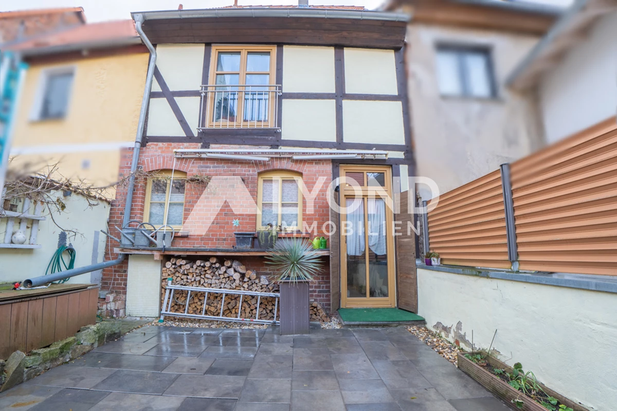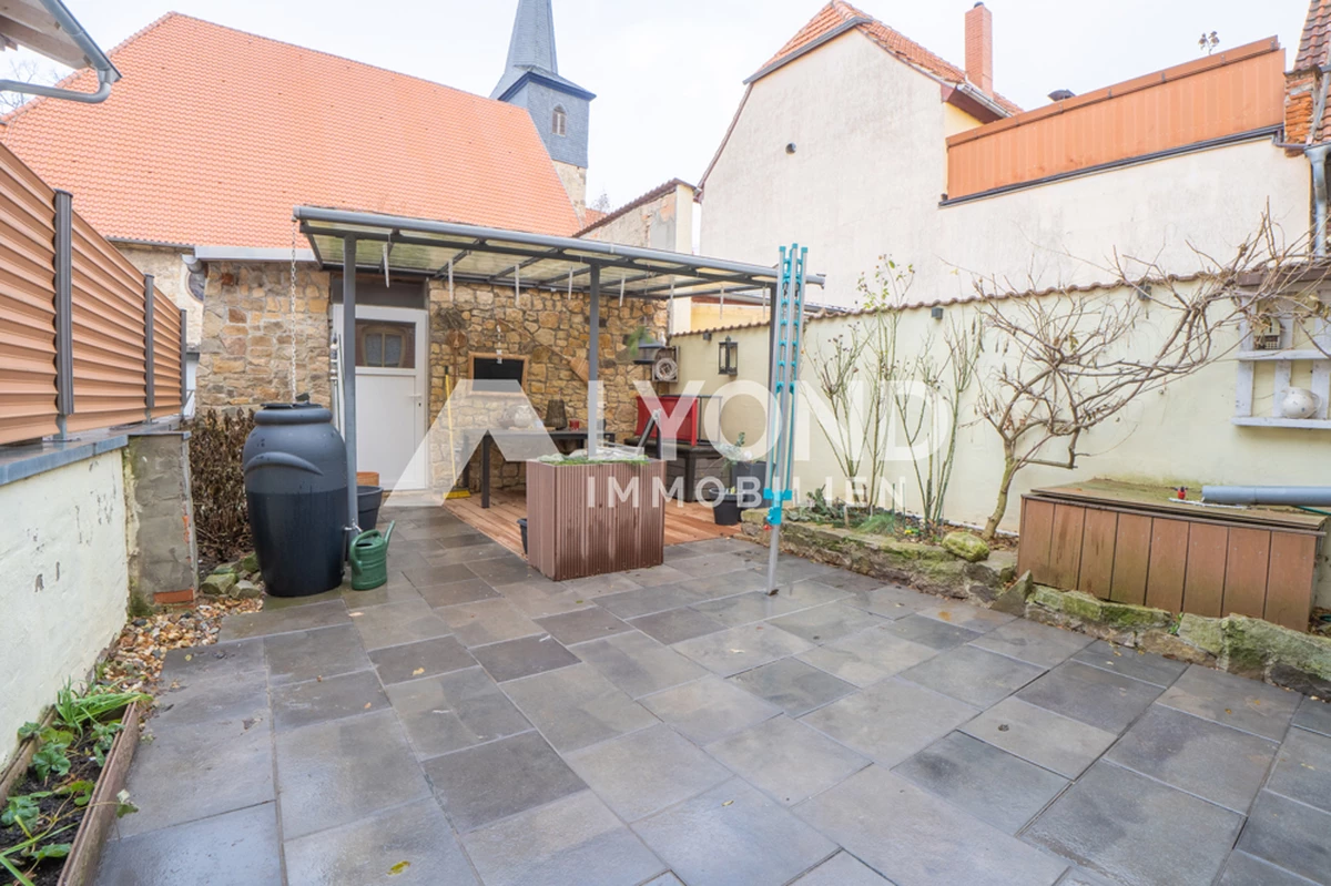 Das ca. 133 m² große Grundstück bietet einen geschützten Innenhof mit überdachter Terrasse sowie eine Garage, die sowohl vom Innenhof als auch von der Straße Kirchhof Ermsleben aus erreichbar ist.