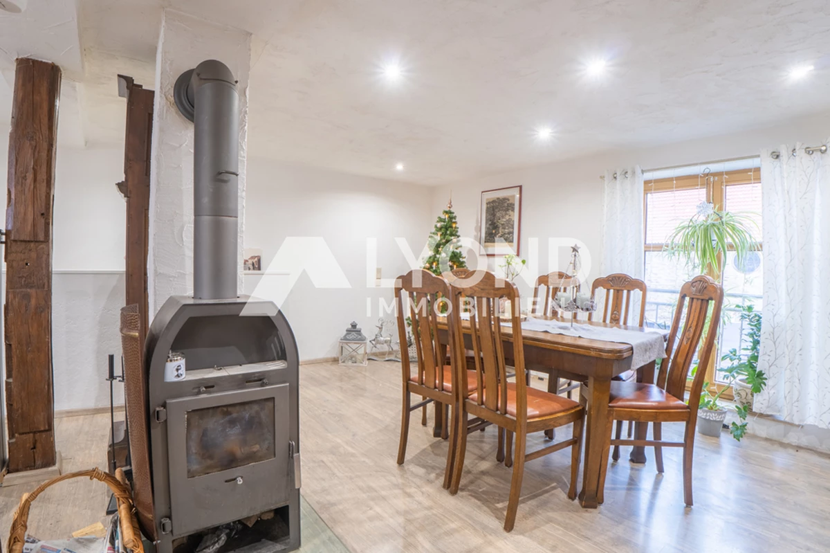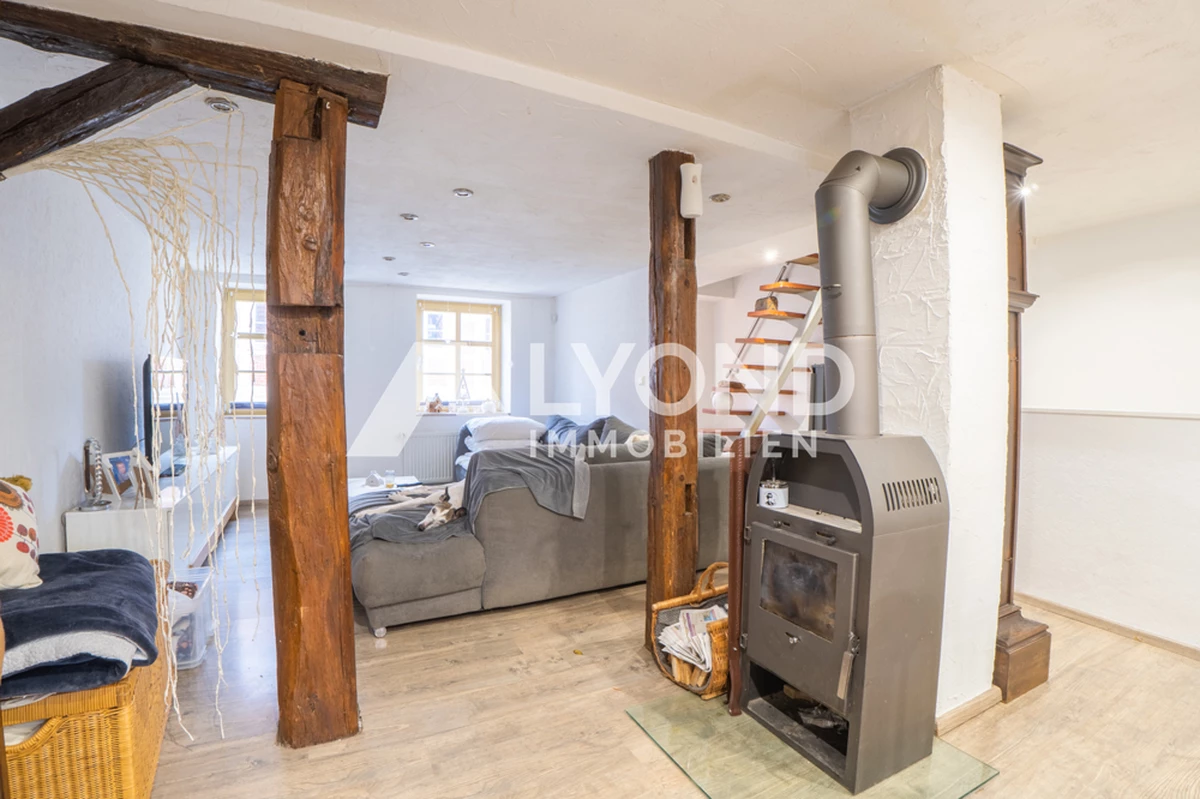 Das Obergeschoss bietet einen offenen Wohn- und Essbereich mit Kaminofen, der für eine angenehme Wohnatmosphäre sorgt.