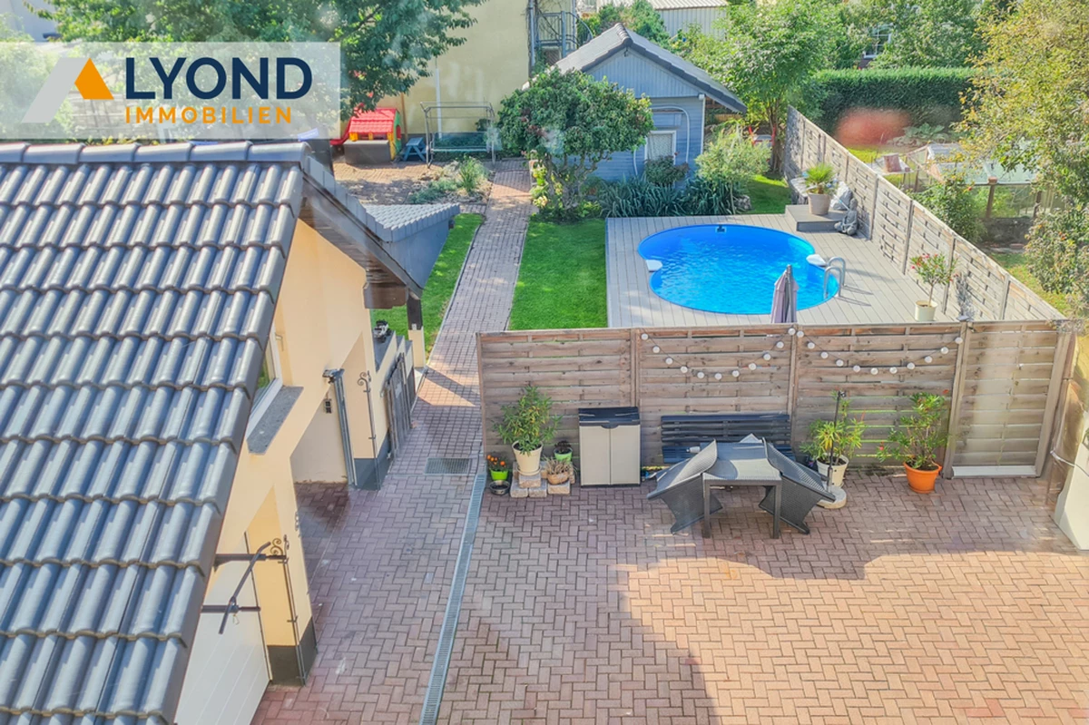 Der Außenbereich besticht durch einen gepflegten Garten, einen Pool, eine großzügige Terrasse sowie eine Doppelgarage und mehrere Stellplätze.